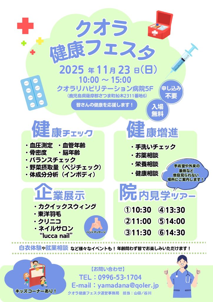 HOME > 更新情報 > 更新情報 クオラ健康フェスタのご案内 2025年10月27日 『皆様の健康を応援します!』という私たちの想いをこめて初開催となる健康フェスタを下記日程で開催いたします。 申し込み不要、どなたでもご参加いただけます。 ご家族やお友達とご一緒にぜひご参加下さい。 たくさんのご参加心よりお待ちしております。 日時:令和7年11月23日(日) 10:00~15:00 場所:クオラリハビリテーション病院(さつま)5階 クオラホール お問い合わせ先:クオラ健康フェスタ運営事務局 山田・谷川 Twitter Share Pocket Hatena LINE URLコピー -更新情報
