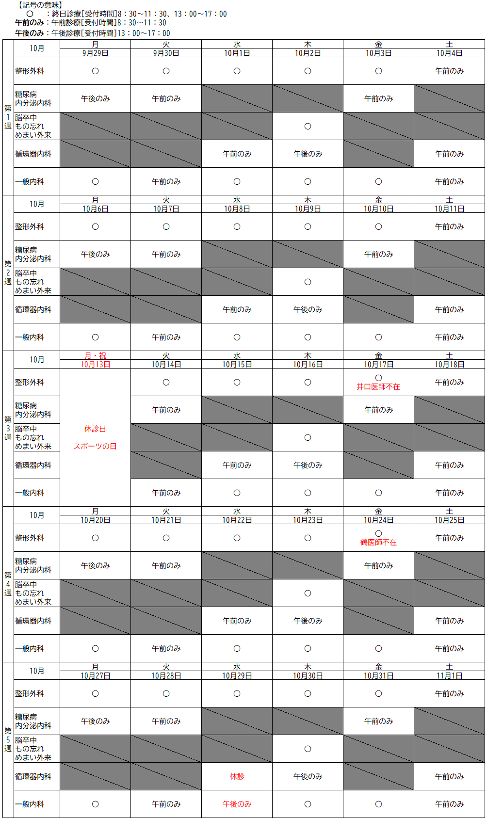 ※この表によらず、急遽診療予定を変更することがございます。 予めご了承ください。