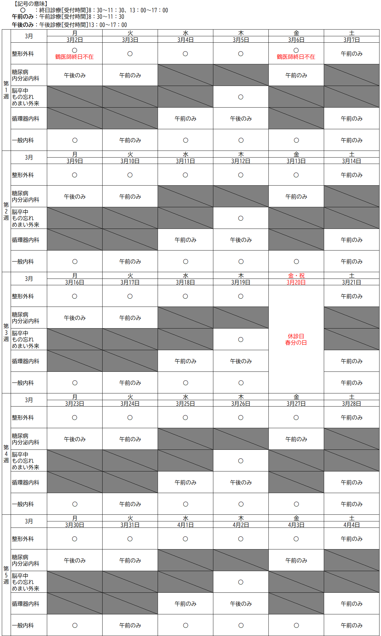 ※この表によらず、急遽診療予定を変更することがございます。