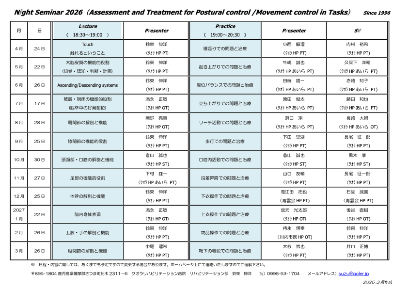 HOME > リハビリテーション研修会のご案内 > ナイトセミナー クオラリハビリテーション病院(さつま町) こちらからpdfをダウンロードいただけます。 過去の実績 ・2025年度 ・2024年度 ・2019年度 ・2018年度 ・2017年度 ・2016年度 ・2015年度 ・2014年度 ・2013年度 ・2012年度 ・2011年度 クオラリハビリテーション病院あいら(姶良市) 過去の実績 ・2019年度 ・2018年度 ・2017年度 ・2016年度 2017年2月27日 2026年3月30日 author