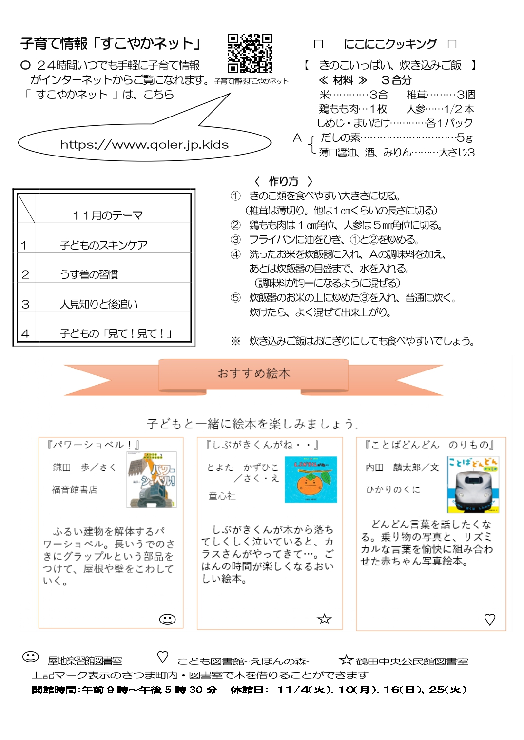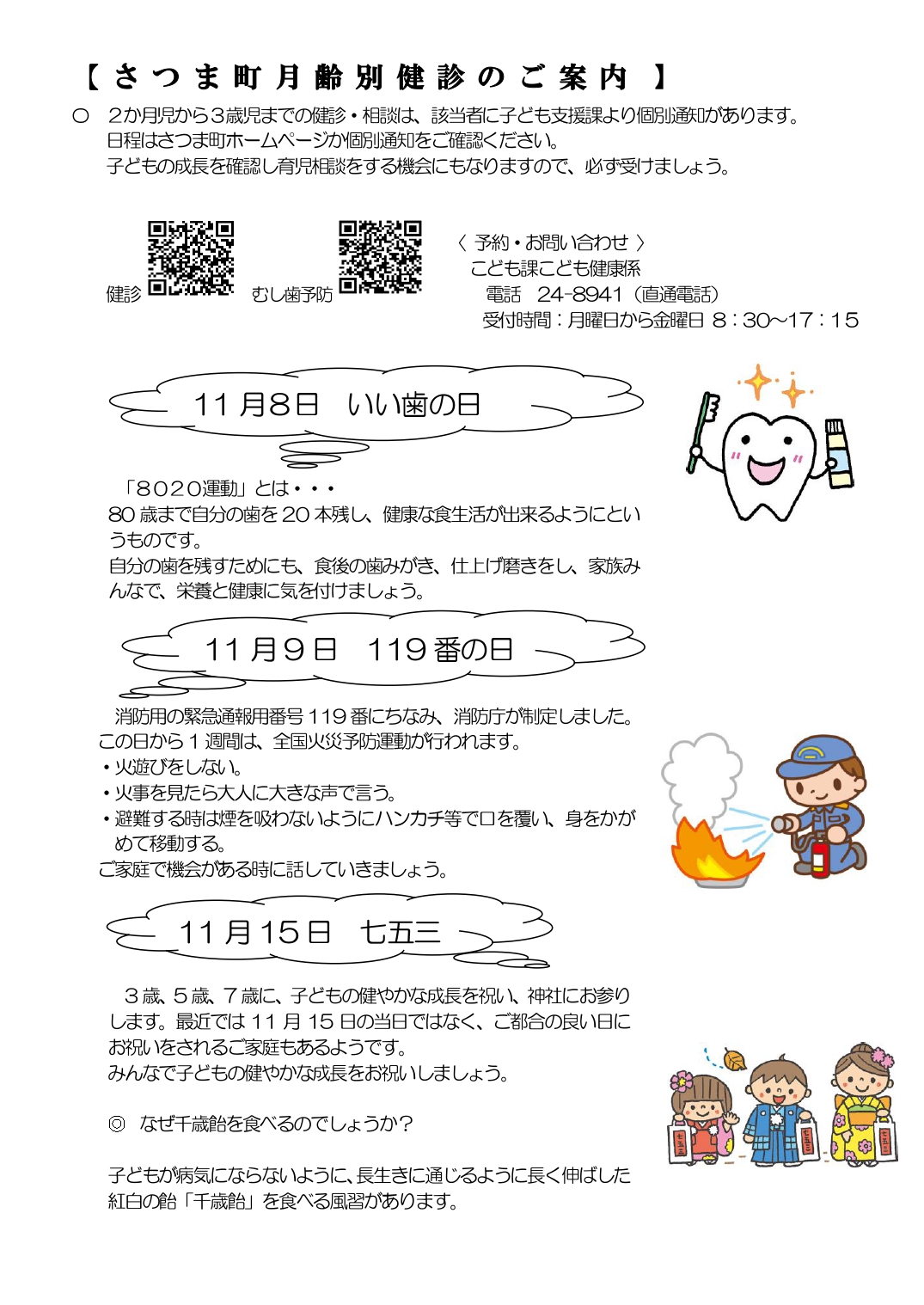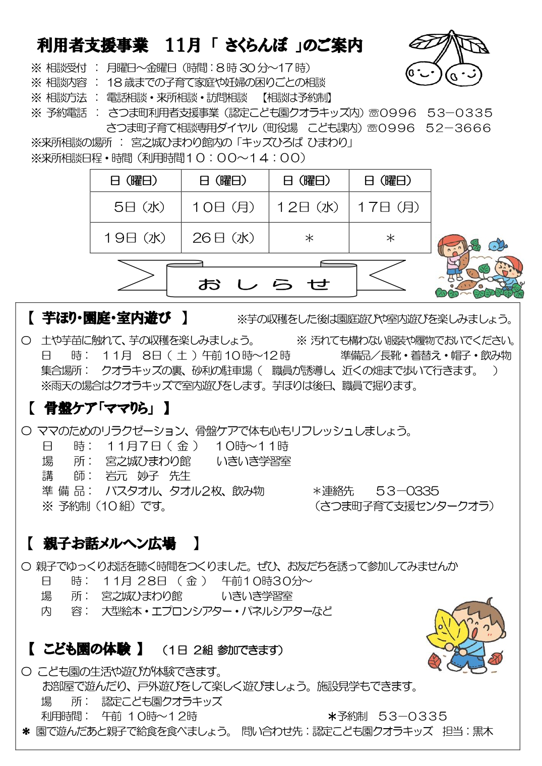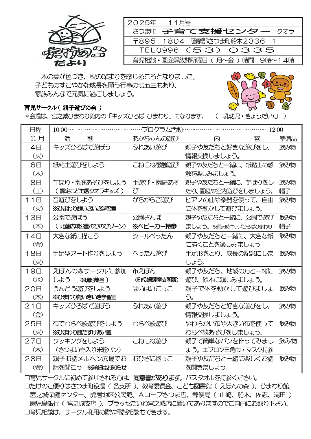 HOME > さつま町子育て支援センタークオラ > たけのこだより > お知らせ たけのこだより たけのこだより2025年11月号 2025年10月27日 町役場(各支所)、教育委員会、こども図書館、ひまわり館、保健センター、虎居地区公民館、Aコープさつま店、郵便局(山崎、船木、佐志、湯田)、鹿児島銀行宮之城支店、プラッセだいわ店にも設置してございます。 こちらからpdfファイルもダウンロードいただけます。 Twitter Share Pocket Hatena LINE URLコピー -お知らせ, たけのこだより